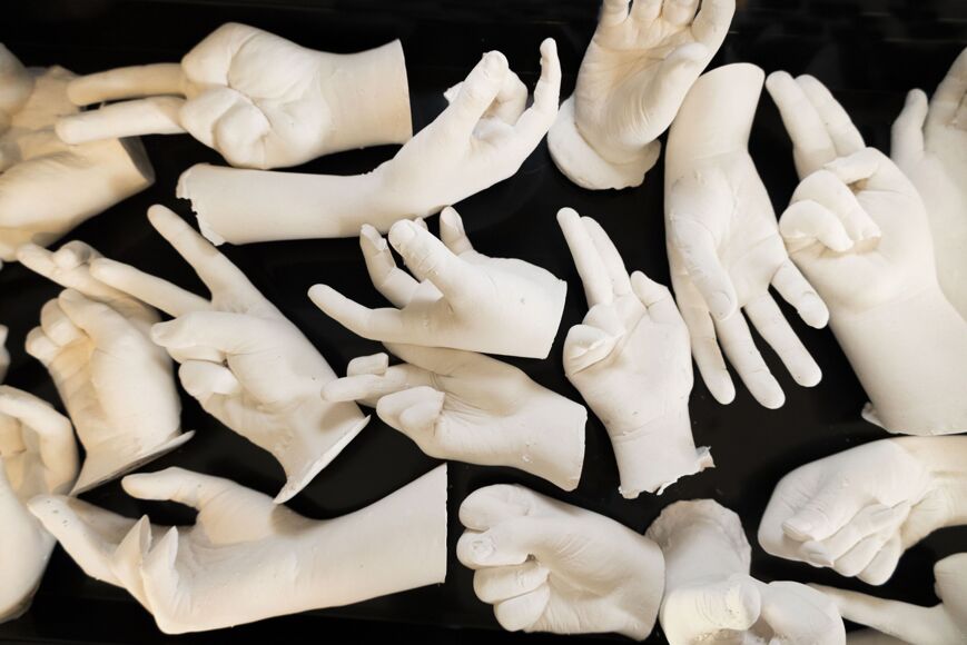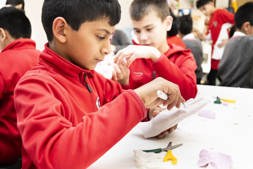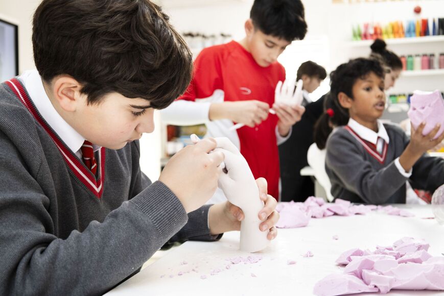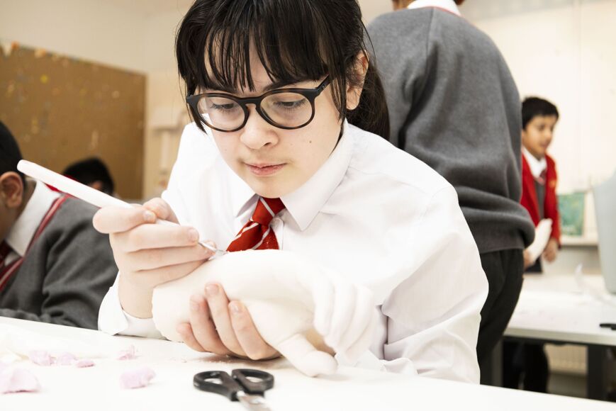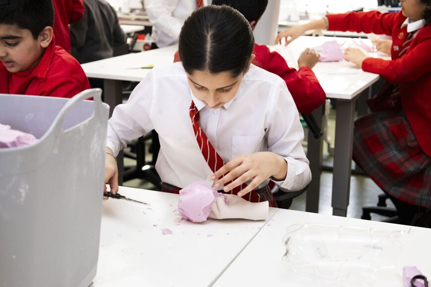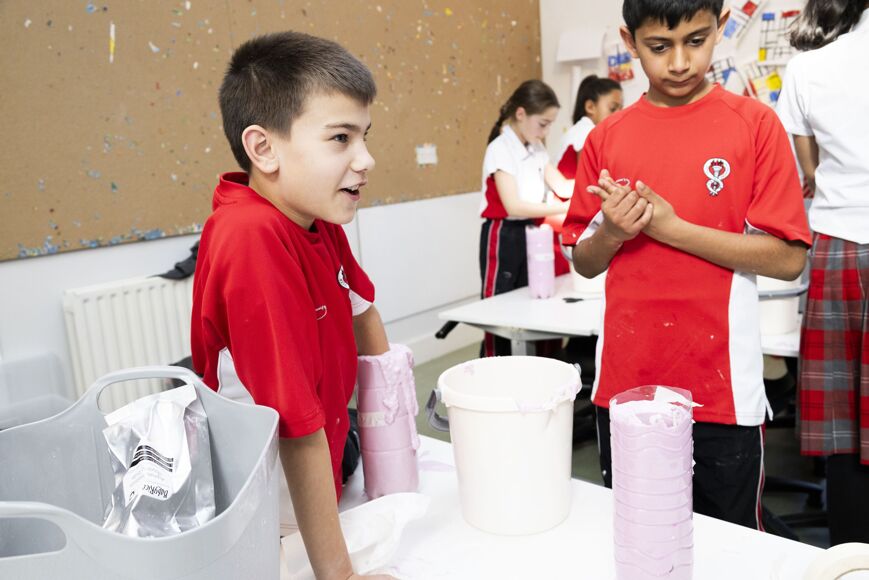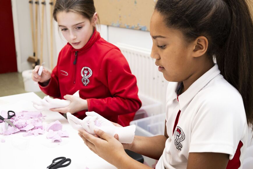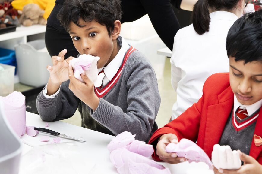 Using alginate, a fast-setting material often used by dentists to take impressions, the children created plaster casts of their hands. The children had under two minutes to mix and pour their alginate into their moulds before plunging their hands into the mixture, holding their hands in their chosen pose before the alginate set. Once casting plaster had been poured into the moulds and set, the children had the task of carefully tearing off the parts of their moulds to reveal their sculptures inside. Particular care had to be taken when removing the alginate from around the fingers as they can easily break.