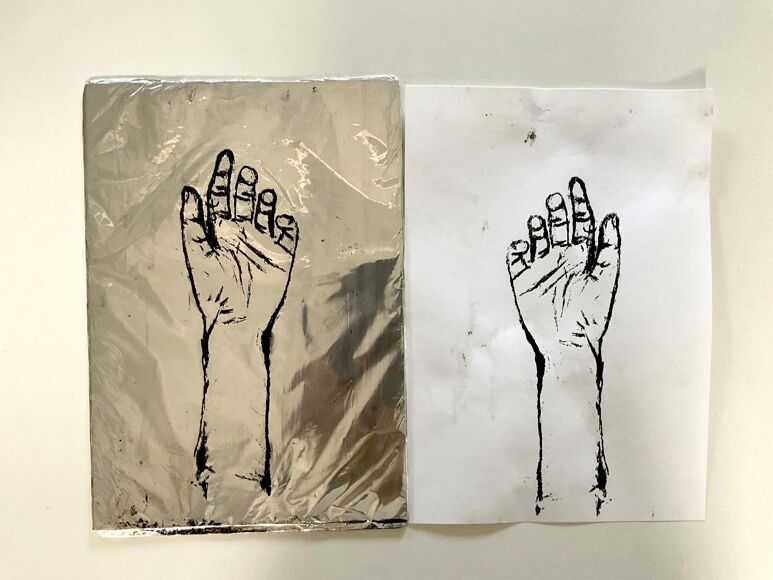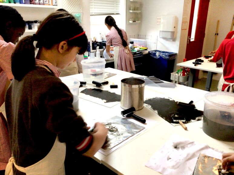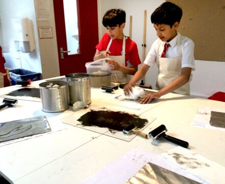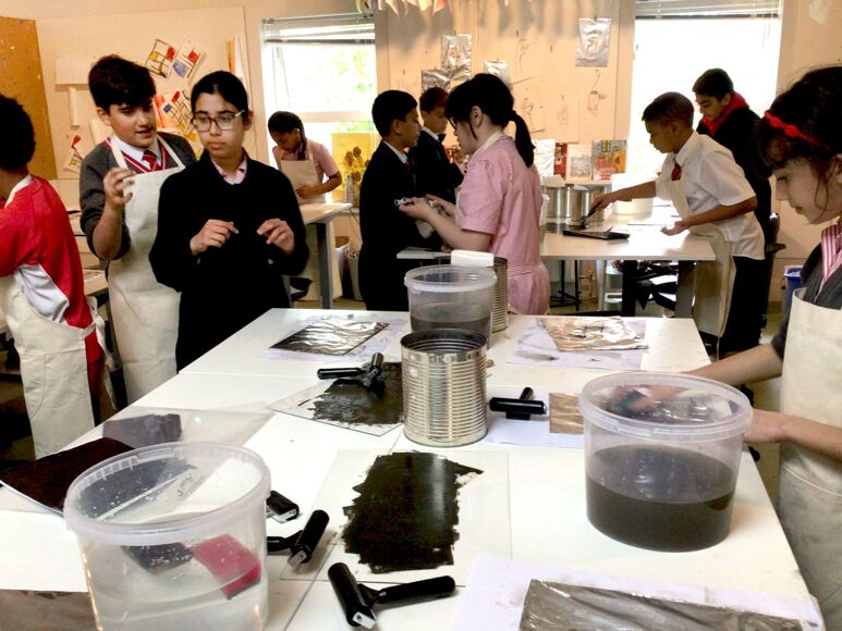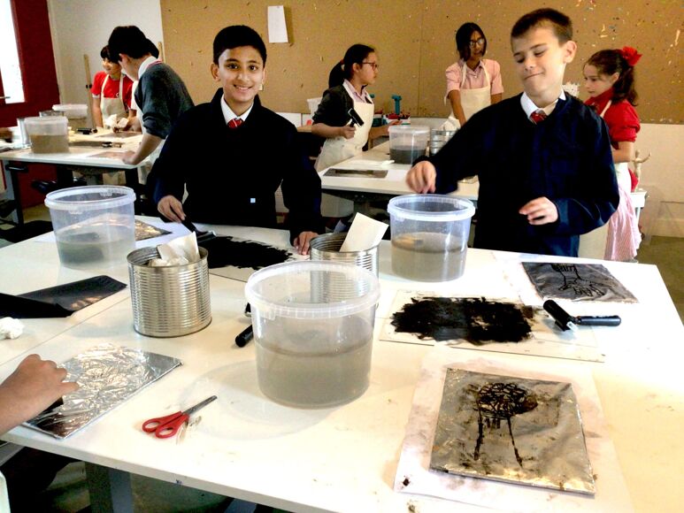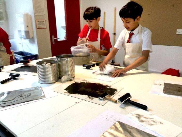 The children first had to create their plate by backing foil on to greyboard. They then used carbon paper to transfer their image on their plate. After the image was transfered, a chinograph crayon was used to ensure their image had marks made with wax/oil. Cola was brushed on to the plate to etch the image into aluminium foil (it contains phosphoric acid). Printing from the plate works on the principle that water and oil repel each other. The plate is first coated with water, which doesn’t stick to the etched image because of the gum arabic in the cola. Oil-based ink is then rolled onto the plate, which sticks to the image but is repelled everywhere else by the water. The plate can be cleaned and re inked at a later date, however during our class discussion the class agreed the plate was visually more interesting and effective than the final print.