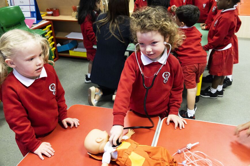 Dr Mannan set up interactive work stations in the F1 classrooms, where small groups of children were given a scenario to think about and under Dr Mannan's instruction, were guided through how best to treat the patient! (a range of unsuspecting dolls and teddies!).